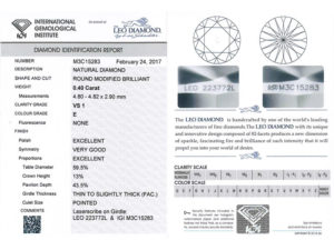 第一行左邊會有一個號碼,這個就是證書的編號和每顆鑽石腰部的激光刻字是對應的,